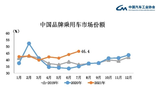 此外,7月,中国品牌乘用车共销售72万辆,环比增长4.1%,同比增长22.2%,占乘用车销售总量的46.4%,占有率比上月增长2.3个百分点,比上年同期提升11.1个百分点。