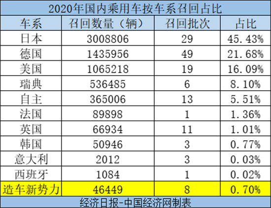 2020召回榜:乘用车达662万辆 "失速门"登顶、"新势力"登台