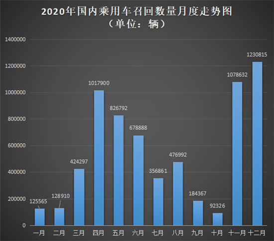 整体来看,2020年,国内乘用车市场共54个汽车品牌发布136次召回公告,累计召回乘用车6622345辆,同比降低1.63%,实现年度召回规模“三连降”。以月度走势来看,个别月份激增的召回量推高了全年总量,4月、11月和12月单月召回量均突破100万辆。