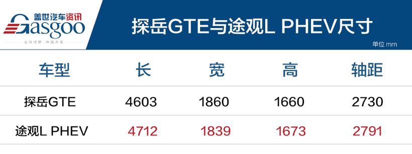 一汽-大众探岳GTE基于汽油版探岳打造,车身尺寸为4603 x 1860 x 1660mm,轴距 2730 mm,因为保险杠等细节变化,探岳GTE的车身比汽油版长了7mm。
