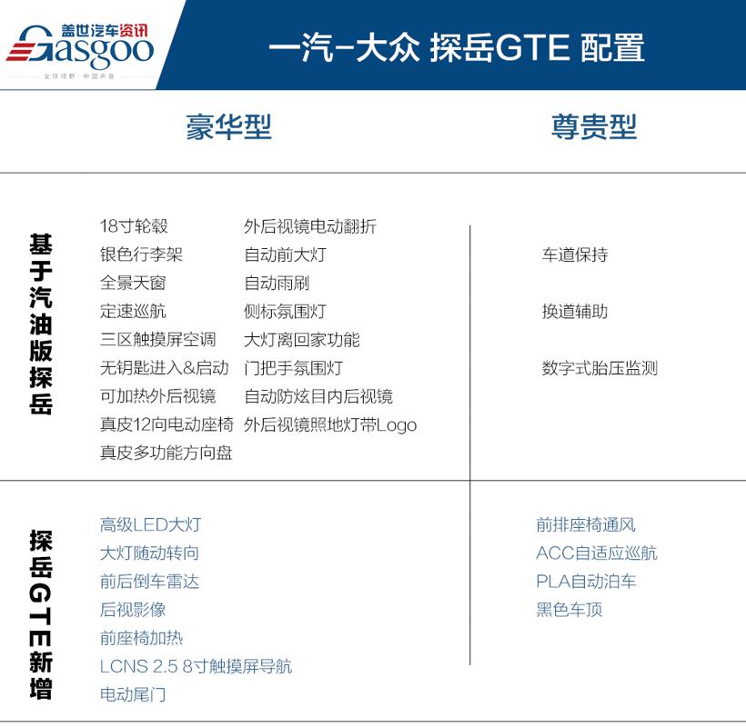 探岳GTE起步配置就与汽油版的豪华型相同,所以基础配置很高,在此之上,探岳GTE还增加了LED大灯、座椅加热、大灯随动转向、电动尾门等配置,顶配的尊贵型又增加了车道保持、ACC自适应巡航、自动泊车等高级配置,具体配置可见下表。