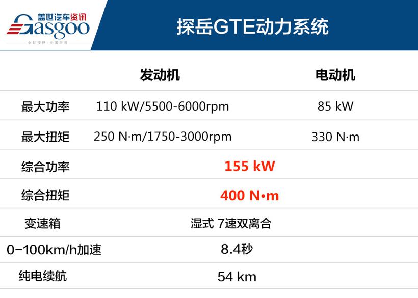 与迈腾GTE、途观PHEV等车型一样,探岳GTE搭载最大功率110kW最大扭矩、250N·m的EA211 1.4T发动机和最大功率85kW、最大扭矩330N·m的HEM80驱动电机,系统综合输出功率为155kW,扭矩400N·m,配合代号为DQ400e的7速湿式双离合变速箱,0-100km/h加速时间为8.4秒,纯电续航是54km。