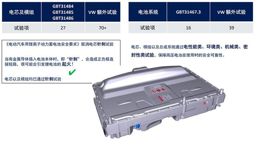 国家对电池及模组、电池系统分别有27项、16项试验要求,大众额外分别增加70多个、39个实验项目,以保障电池安全。在机械冲击和振动实验环节,国标不要求电池上电测试,大众除了标准更高,而且要求必须使用1个电池包,也就是对一个电池包进行“反复摧残”。