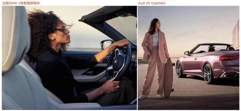 大家看这里面高级的场景表达,大家看右边的这张图片,这是宝马的场景,它表现了非常独立的女性开着车到旷野欣赏美景。大家能看到这些比较高级的场景表达,这种海外的主流品牌是非常有优势的。