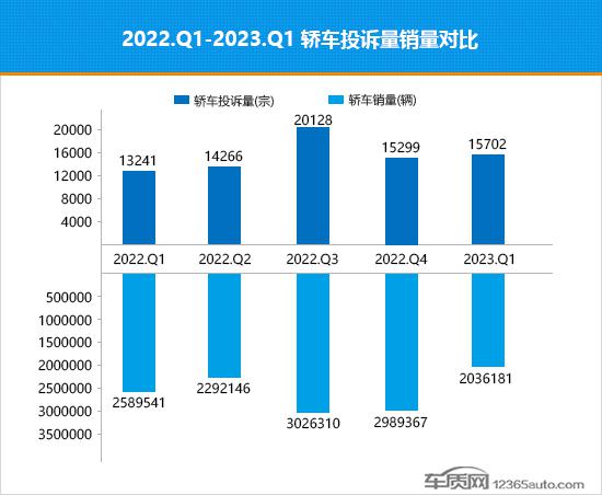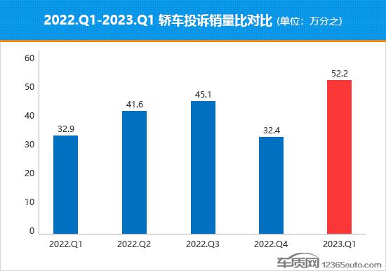 据国内领先的缺陷汽车产品信息收集平台车质网数据显示,2023年一季度共受理国内轿车投诉量累计为15,702宗,乘联会数据显示同期国内轿车(除进口车)销量约为203.6万辆。除进口车型外,一季度有销量数据支撑的轿车共有200款,为确保数据的准确性,车质网本次只统计这200款车型的首次投诉案例,计算得出2023年一季度轿车投诉销量比均值为万分之52.2,数值较2022年四季度的万分之32.4大幅上升,季度投诉销量比表现出现明显转差迹象。