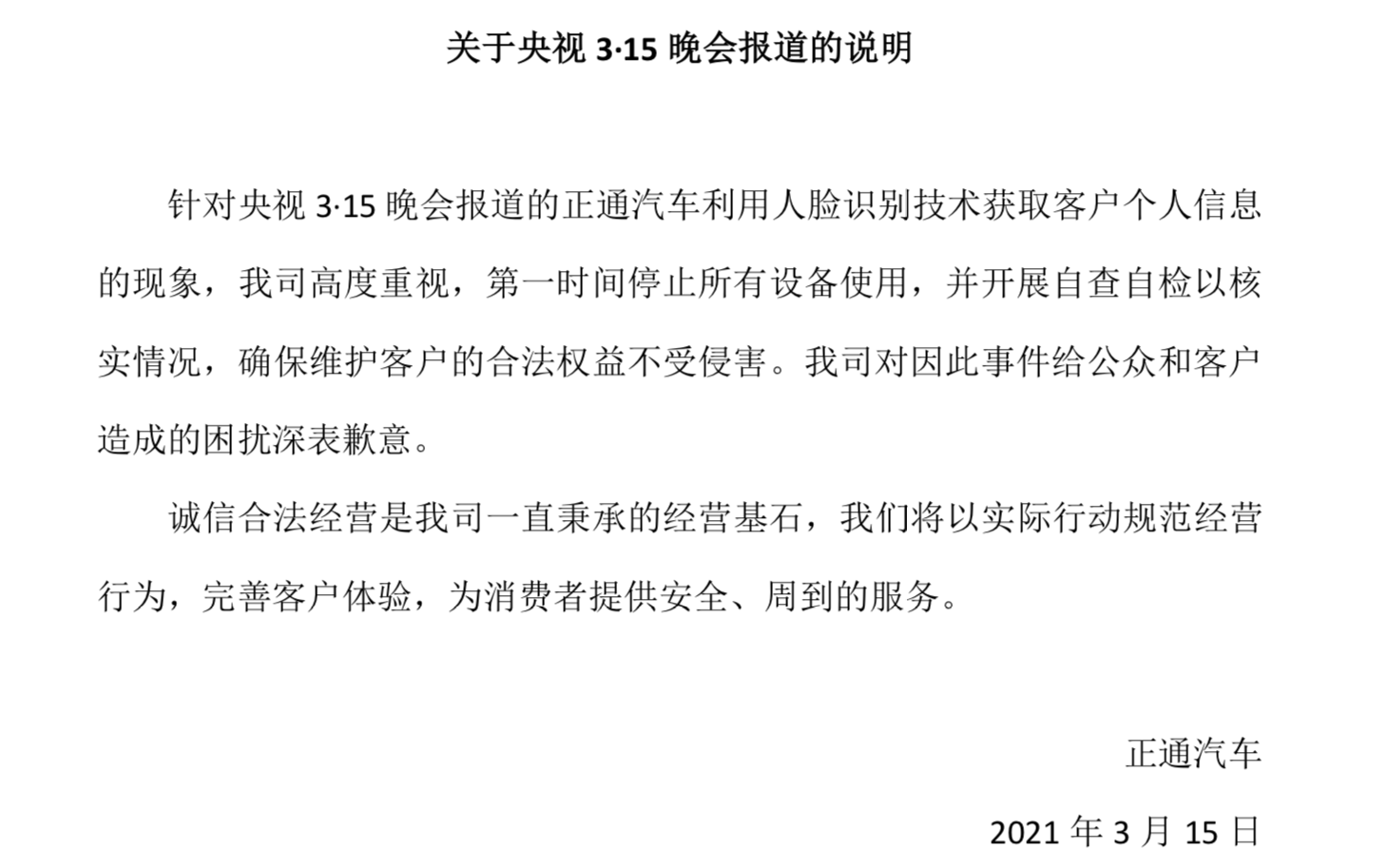 今日,正通汽车针对央视315晚会报道的利用人脸识别技术获取客户人个人信息的现象做出正式回应。回应全文如下: