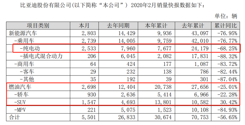 具体来看,当月旗下燃油版轿车、SUV及纯电动乘用车降幅优于比亚迪整体水平,同比分别下滑64.7%、67%及68.2%,而降幅最大板块则集中在插电式混动乘用车及燃油版MPV,降幅均超95%。且,值得注意的是,今年1-2月中,比亚迪燃油版SUV车型累计销量达1.4万辆,同比增长30.4%。