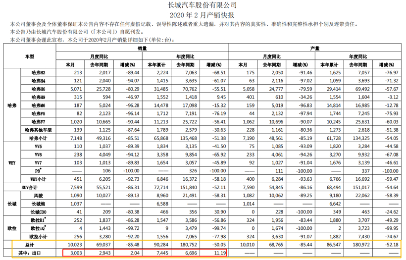 总体来看,2月,长城旗下哈弗品牌、WEY品牌、新能源品牌欧拉均都出现了较大幅度的下滑,长城汽车仅在出口方面保持了以往的水准,达3,003辆,同比微增2.04%。