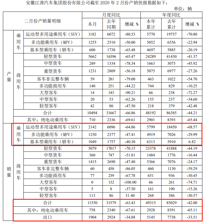 具体而言,2月份中,江淮汽车共计销售各类乘用车4,441辆,同比下滑56.6%。这其中轿车及MPV降幅均在40%左右,而SUV车型当月销售2,142辆,同比跌幅达70%。新能源领域,2月江淮汽车共销售758辆纯电动乘用车,同比下滑67.61%。