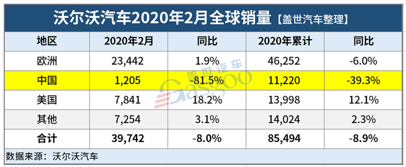 3月4日,沃尔沃汽车公布了其2月份全球新车销量。由于中国的新冠病毒疫情给销量带来了持续压力,该公司上个月在全球范围内共售出4万辆新车,较去年同期下降8%。其中,沃尔沃在华单月仅售出1,205辆新车,同比大跌八成。