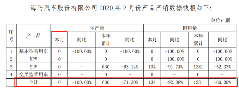 对此,海马汽车官方回应,1-2月份因春节提前和疫情因素,导致汽车产销量受到较大影响,但目前员工除疫区外已大部分返岗,生产正在逐步恢复,海马汽车预计产销量将于3月份恢复。